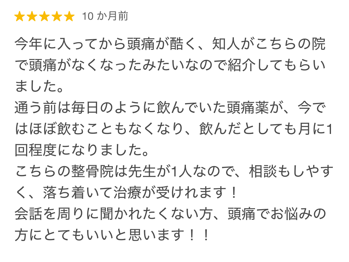 「季節の変わり目になると頭痛がひどく、市販薬をほぼ毎日飲んでいました。いっきょう整骨院で首や後頭部の筋肉をほぐしてもらうようになってから、薬を飲む回数がぐっと減りました。今では月に1~2回程度に!仕事も集中できるようになりました。」
